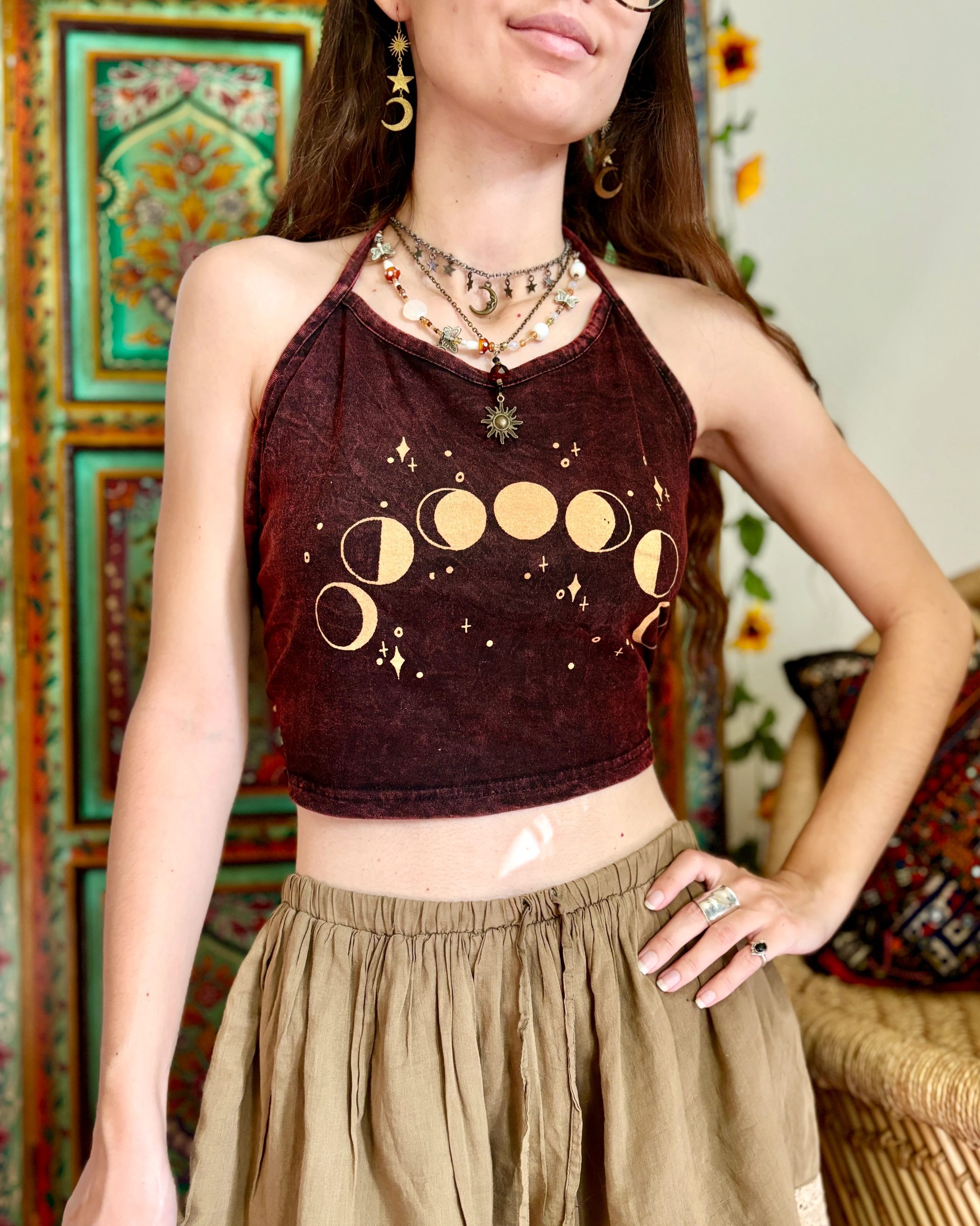 Introducing our stunning Celestial Moon Phases Halter Top, intricately designed to bring elegance and cosmic charm to any wardrobe. This captivating halter features a rich color palette of deep burgundy that sets the stage for an enchanting golden moon phase motif elegantly printed across the front.