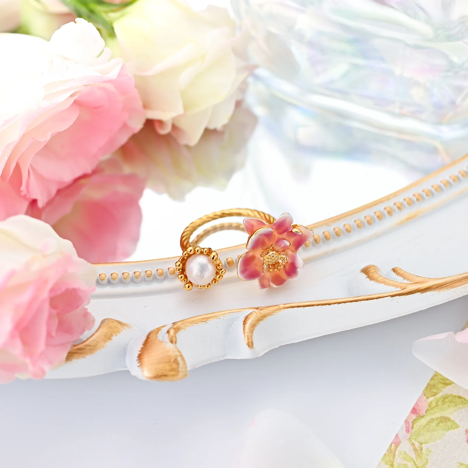 The ring’s band showcases a delicate twisted design, adding a touch of vintage appeal and making it a versatile accessory for any occasion. The enamel flower presents soft pink hues that harmonize effortlessly with the faux pearl’s opalescent shine, creating a captivating visual balance. Perfect for those seeking a stylish yet affordable statement piece, this ring embodies artistry and practicality in its design.