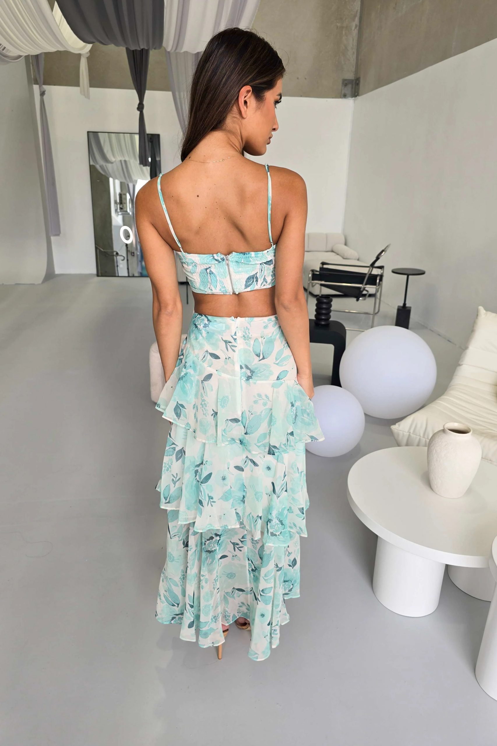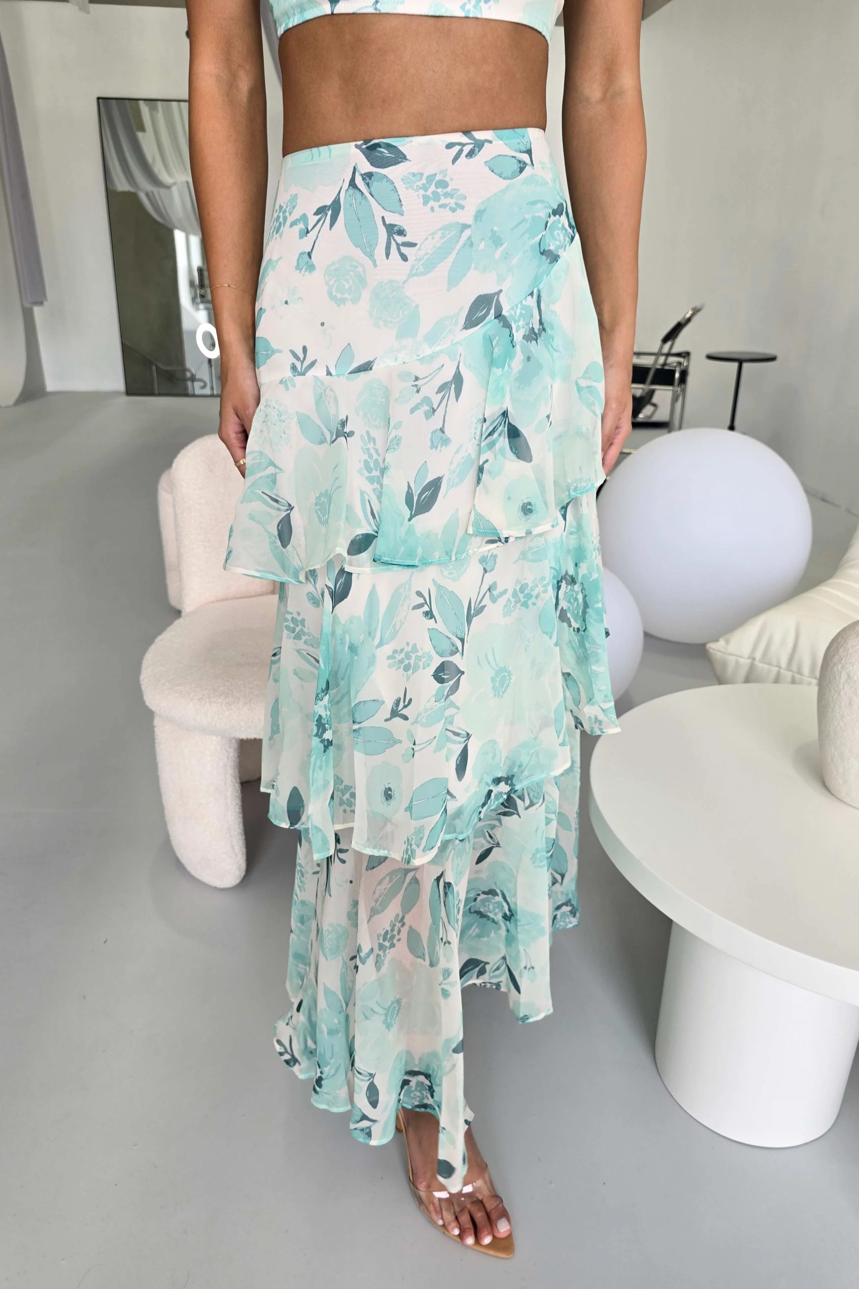 The skirt cascades gracefully down with its layered design, adorned with a gentle floral pattern that dances with every step. Its airy fabric allows for effortless movement, while the pastel hues provide a refreshing burst of color, aligning perfectly with the season.