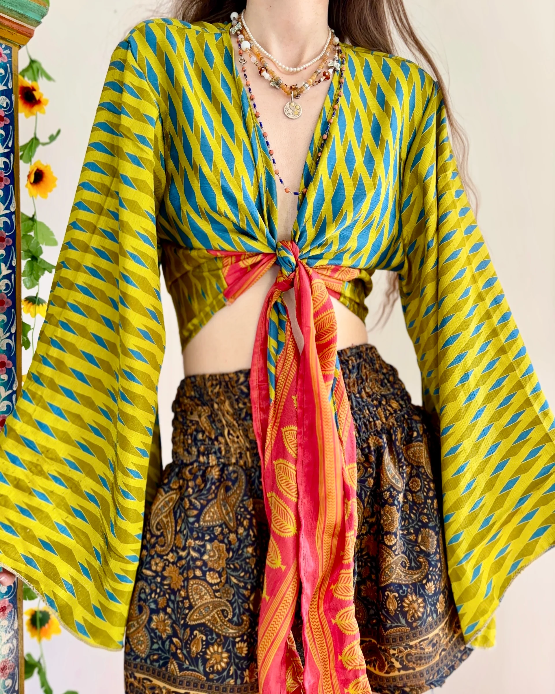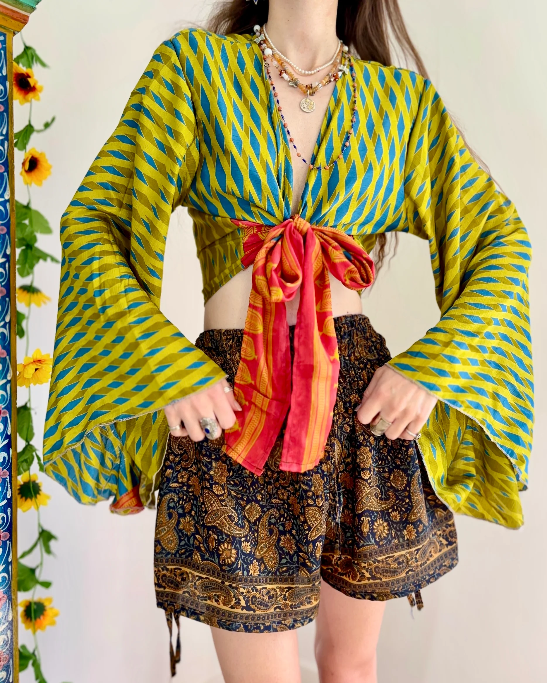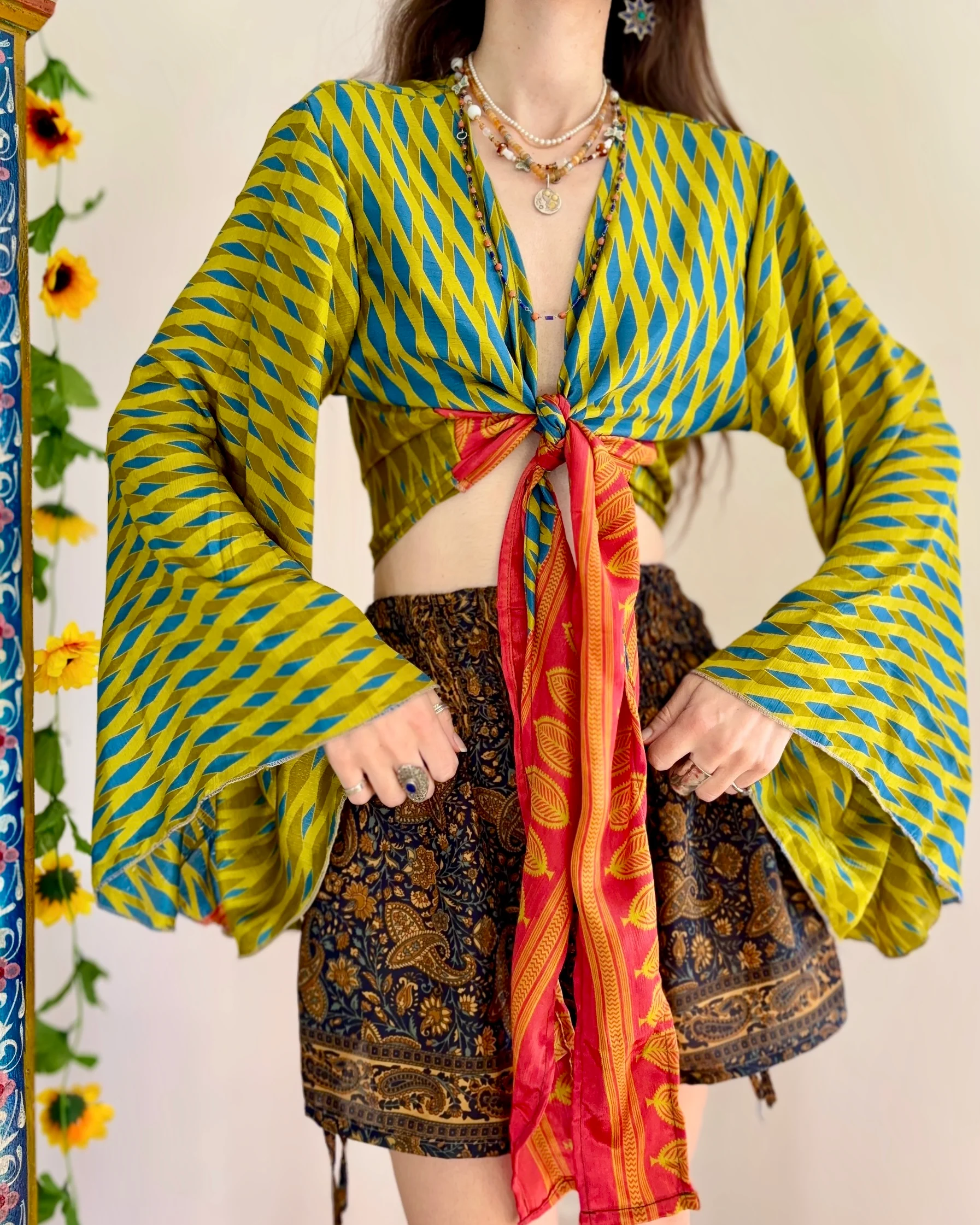 This enchanting bohemian top effortlessly combines vibrant colors and bold patterns to create a truly eye-catching apparel piece. Designed with a unique combination of green and blue geometric patterns, the blouse features flowing bell sleeves that add a touch of chic elegance to the casual silhouette. The deep v-neckline is beautifully complemented by a contrasting red tie, allowing you to customize the fit with ease.
