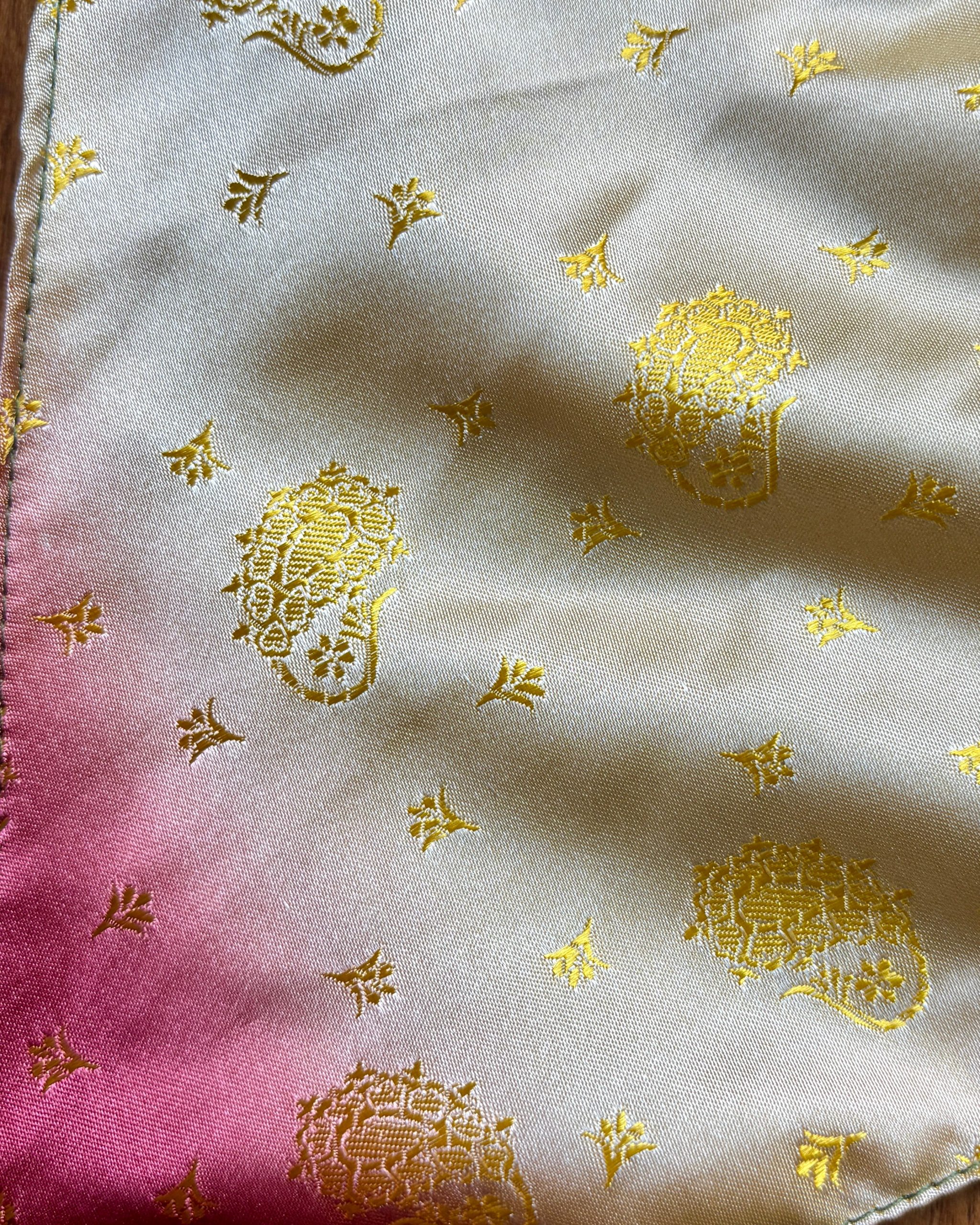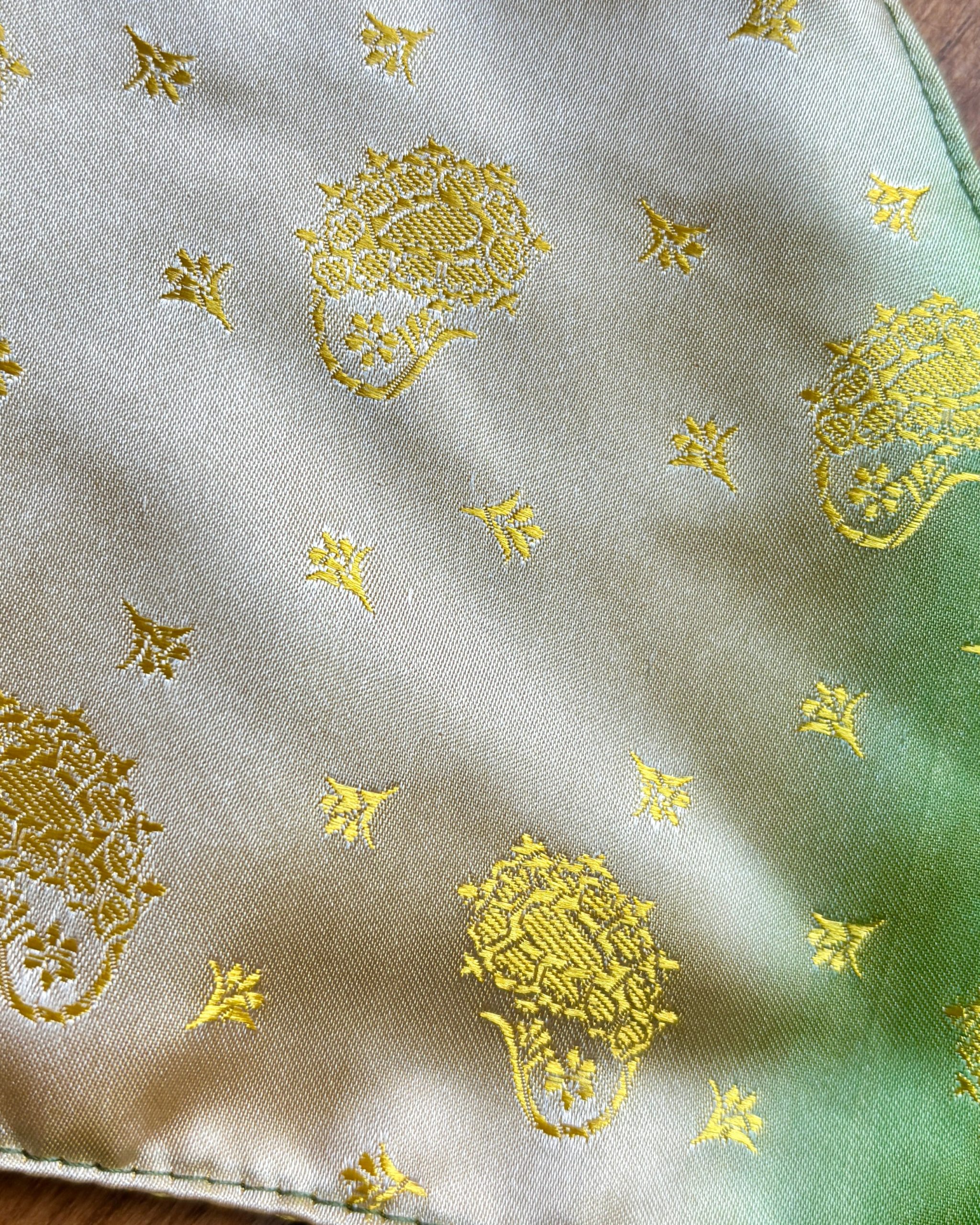 The striking camisole is adorned with a delicate gold floral pattern over a soft, silky fabric. The playful mixture of colors from green to pink makes it perfect for a summer outing or festival wear. The fabric has a luxurious sheen, adding elegance to its artistic design.